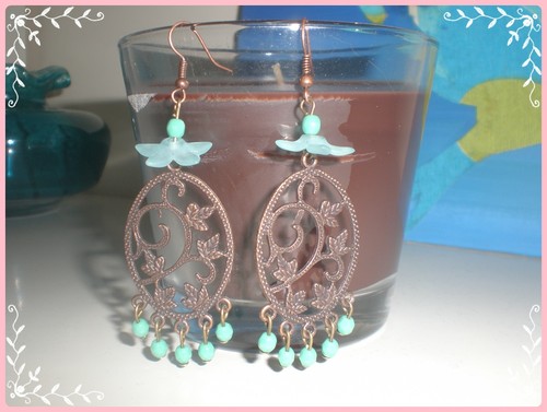 Brincos compridos em base metálica cobre, cristais checos azuis esverdeados e flor acrílica verde...
