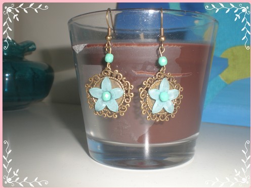 Brincos médios com base trabalhada em ouro velho, cristais checos azuis esverdeados e flor acrílica...