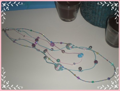 Colar de três voltas, com fio de algodão e fio metálico, corrente, missangas, contas acrílicas, contas metálicas, contas em tecido e em vidro...
