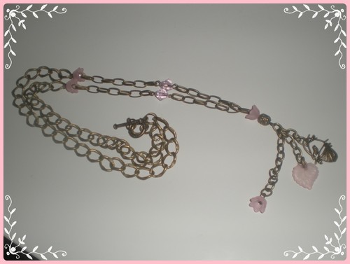Colar médio em corrente ouro velho com fecho metálico, flores acrílicas rosa, cristais checos rosa, contas ouro velho e pendentes - passarinho no ninho, folha acrílica e flor rosinha...