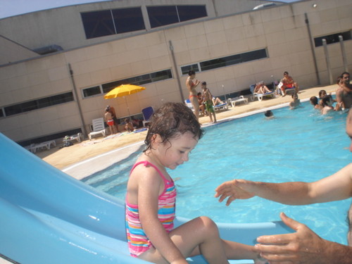 Domingo de manhã fomos os 4 à piscina, o Ken deseducou a pequena Lu, que até aqui mergulhava imenso e brincava com os bebés só na piscina pequenina (= tanque com água pelos joelhos) e agora já vai ai escorrega e desce pelas escadas da PISCINA GRANDE!!!