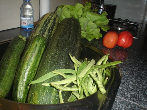 Mudando de assunto, uma das vantagens de viver numa pequena aldeia, (além de as crianças perceberem que as galinhas não nascem nas arcas frigoríficas do Continente) é os vizinhos/vizinhas nos oferecerem aquilo que a terra lhes dá (uma vizinha minha usa uma frase muito engraçada :"Deus quando dá é para todos"). Ontem à noite à hora de jantar recebi um sms: "vem buscar uma alface". Lá desci eu a rua e passados minutos voltei com uma saca com uma alface , 3 tomates, uma enorme courgette.