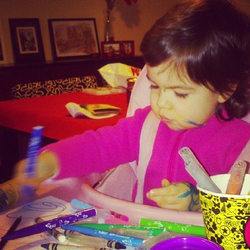 Felizmente a tinta destas canetas é lavável e sai muito facilmente quer da pele, quer da roupa. Mesmo assim, achei por bem vestir um casaco de andar por casa, não fosse estragar a toilette!