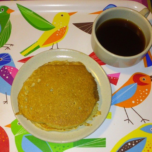 Hoje acordei com uma Pinypon madrugadora que reclamava das bátegas que batiam nas janelas. Aqui a tempestade parece sempre pior. Trouxe-a para a cama comigo e assim ficámos aconchegadas. À hora de levantar achei que merecíamos um miminho pelo pequeno almoço neste dia tão desconsolado. Venham as panquecas! De aveia, quentinhas e com doce caseiro de pêssego.
