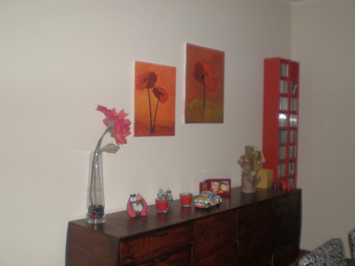Faltava pendurar os quadros e no sábado passado o meu querido paizinho lá fez o favor de ir brocar lá para casa. Acho que endoideci os meus pais com tantas medidas. Que fazer? Coisas de Aquitecta.