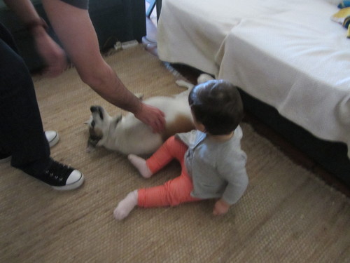 Depois, allez à la maison buscar a nossa Pinypon que ficou entregue aos cuidados da vóvó, e que finalmente se apercebeu que existe mais um membro da família, chamado Gu, o cão dos meus pais. Agora diverte-se a chamá-lo no seu linguajar muito próprio e chora se ele se pira. Ele por sua vez também já deu conta dela, porque antes não lhe ligava nenhuma.