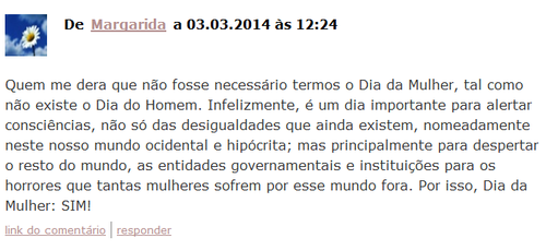 Antes de mais, adorei ver tantas participações e tantos comentários sobre o Dia da Mulher, alguns eram bem hilariantes e outros muito poéticos!